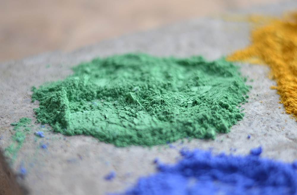Die Lehmabtönfarbe Reifgrün besteht in ihrer Basis aus Pigment. Dieses ist aber schon so aufbereitet, dass man direkt damit arbeiten kann (z.B. Bilder malen) oder dieses zum Abmischen oder Verstärken der Standardfarbtöne beimengen kann. Mit normalen unvorbereiteten Pigmenten würde das nicht gelingen. Hier ist ein größerer Vorbereitungsaufwand nötig. Ein weiterer Vorteil gegenüber Pigment ist, dass keine Höchstzugabemengen beachtet werden müssen. Die Lehmabtönfarbe Reifgrün wird in Pulverform geliefert und identisch den Lehmfarben angerührt und verarbeitet. Die sonstigen Inhaltsstoffe sind wie bei den Standardfarben natürliche Rohstoffe, nur in anderer Zusammensetzung.